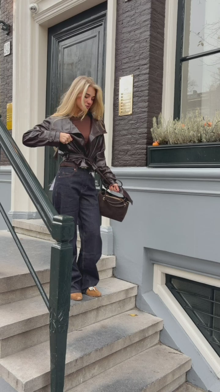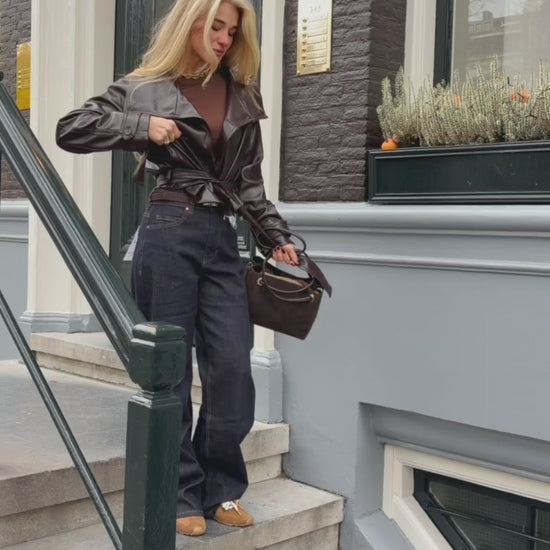 Het lak leren jack is een echte eyecatcher. Dit cropped jasje van glanzend lakleer in diepe burgundy geeft elke outfit een krachtige, stijlvolle uitstraling. De knoopsluiting en het ceintuur aan de onderkant zorgen voor een flatterende pasvorm en een edgy touch. Perfect om je look nét dat beetje extra te geven van casual denim tot een avondlook.