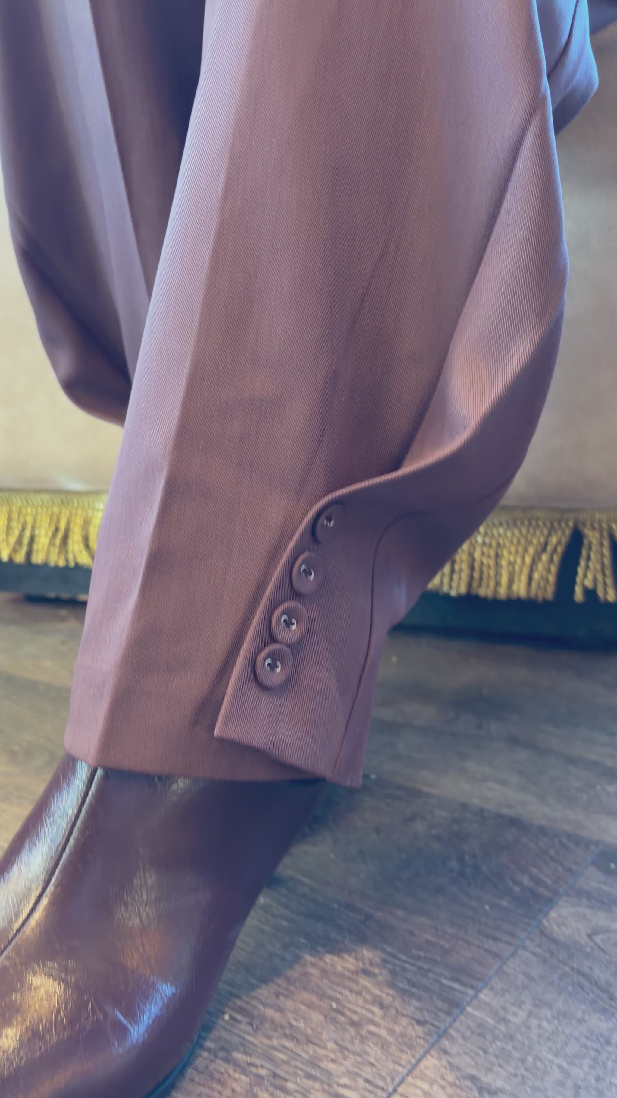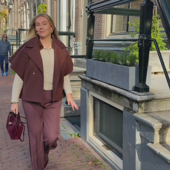 De Panthalon Bordeaux combineert een klassieke kleur met een speelse, moderne pasvorm. Deze bordeauxrode broek met bruine ondertonen sluit aan de onderkant met knopen, waardoor een subtiele ballonlook ontstaat. Gemaakt van een zachte, comfortabele stof die mooi valt, perfect om zowel casual als chic te dragen.
