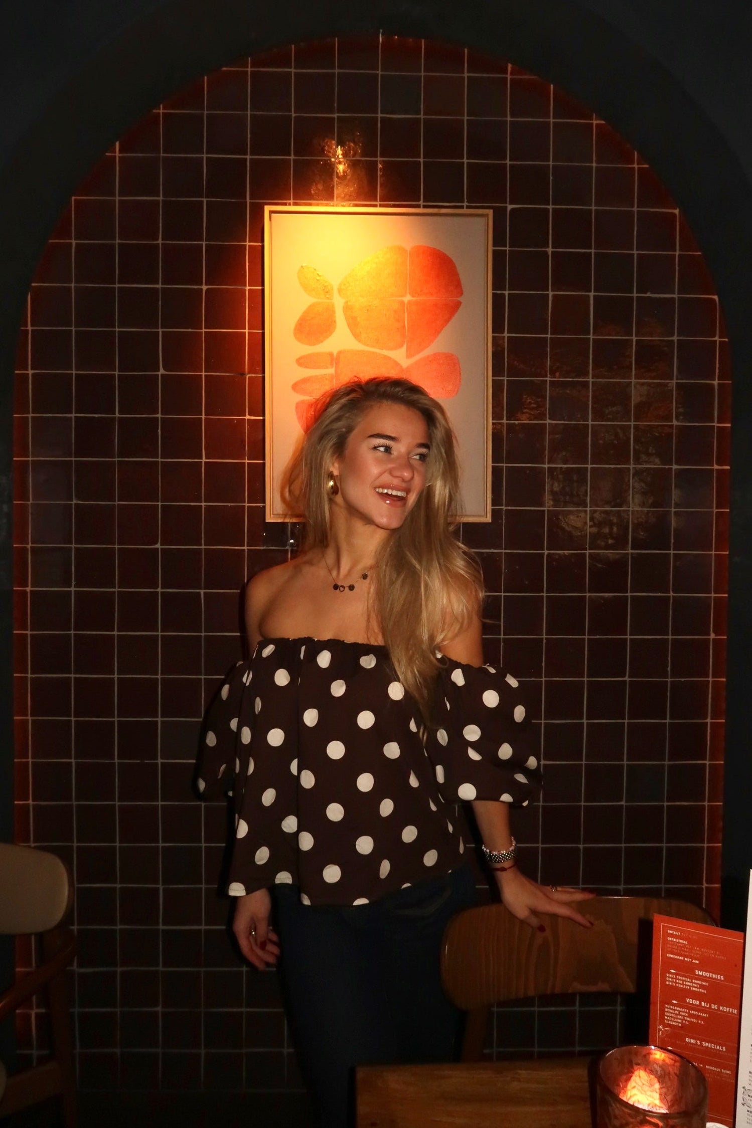 De Polkadot Top is een echte eyecatcher met een speelse, maar vrouwelijke uitstraling. De bruine basis met witte stippen geeft een frisse retro vibe, terwijl de pofmouwen zorgen voor een trendy silhouet. Draag ‘m off-shoulder voor een flirty look, of met de mouwen omhoog voor een iets klassiekere stijl — jij bepaalt wat bij de gelegenheid past.