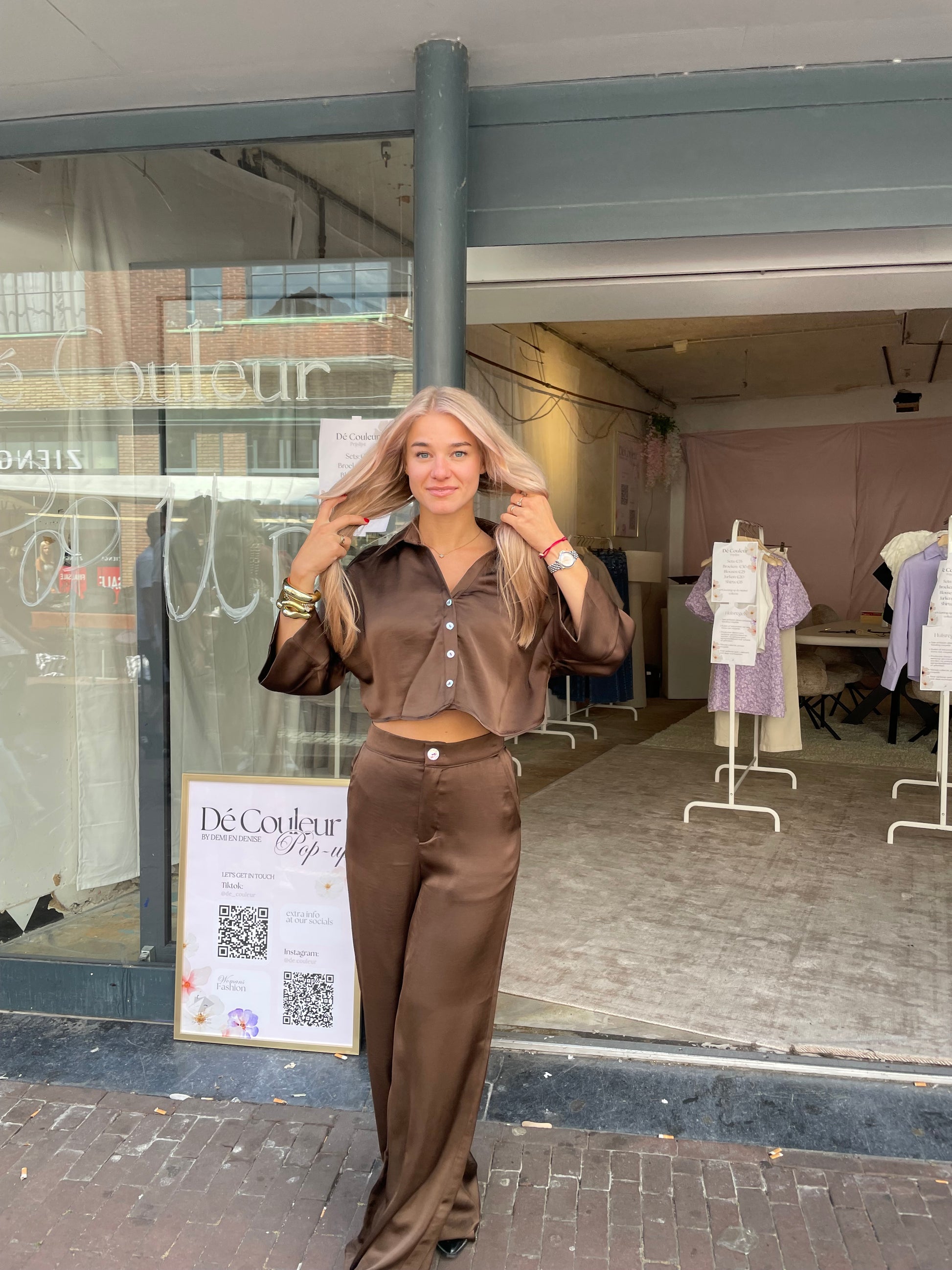 Bruine Satin Pantalon – Hoog Getailleerd & Elegant