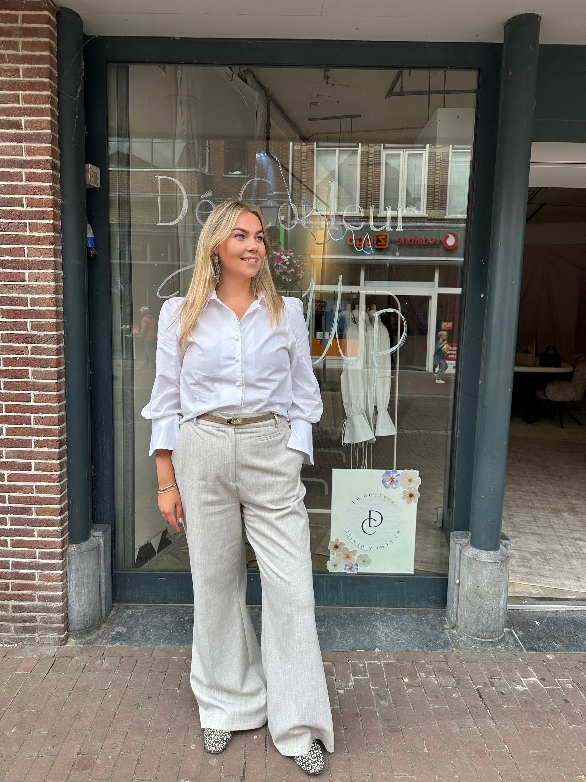 De Scalp Blouse Daisy is een elegante witte blouse met een verfijnde, opvallende kraag en sierlijk uitlopende mouwen. Gemaakt van luchtig en kwalitatief katoen voor een comfortabele én stijlvolle uitstraling. Een veelzijdig item dat zowel chic als casual gedragen kan worden.